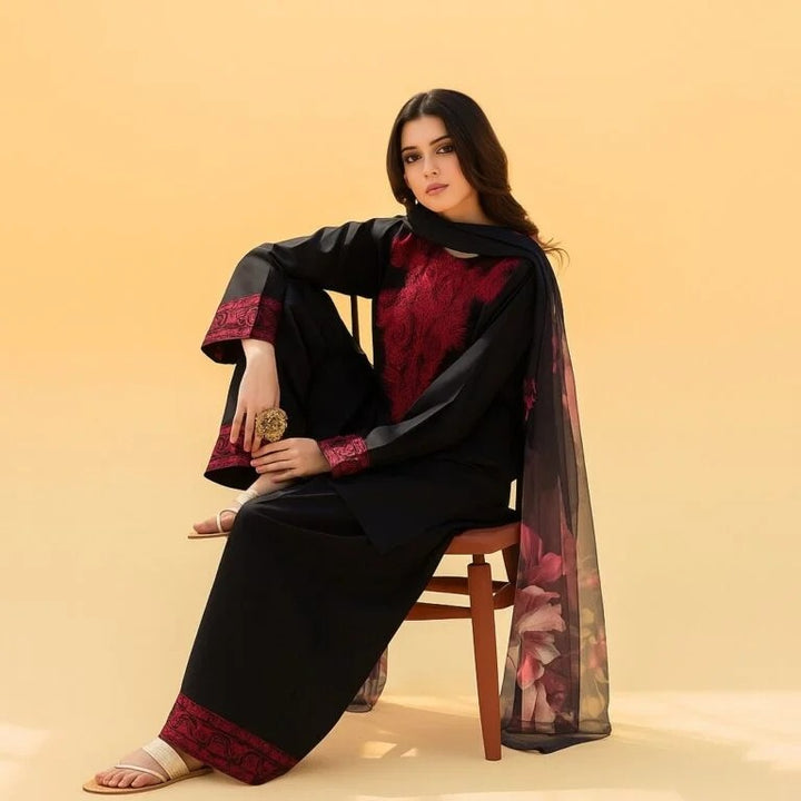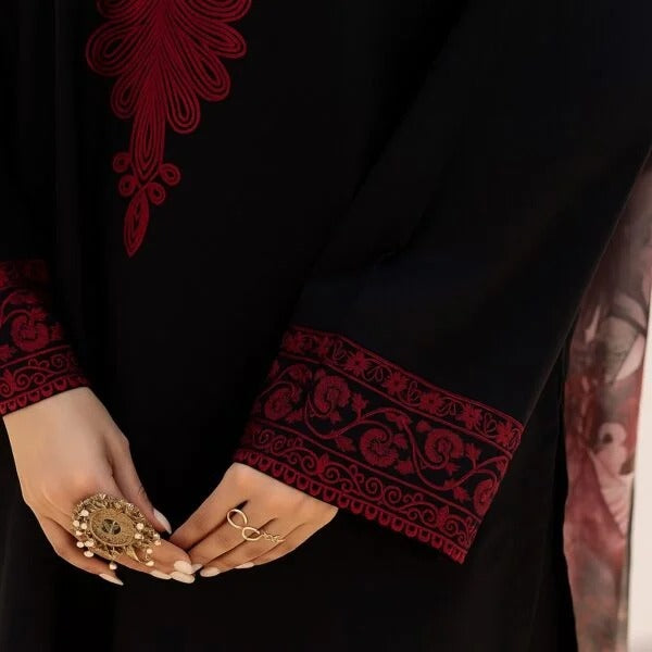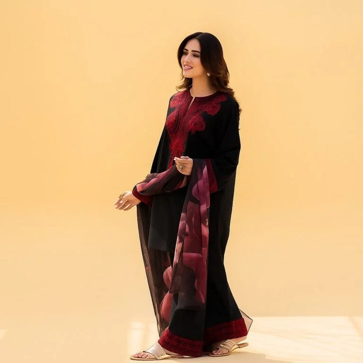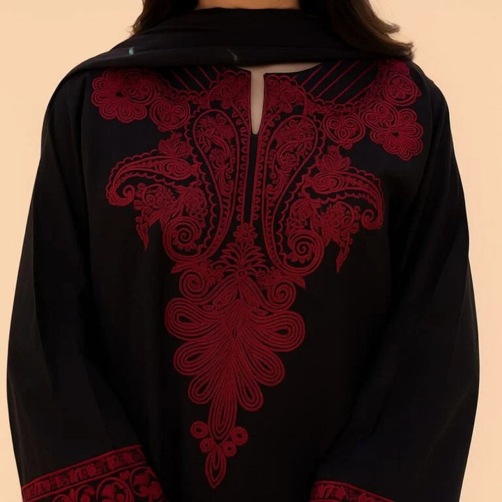 A stunning fusion of bold elegance, this dress features intricate embroidery in vibrant red on a sleek black base. Perfect for festive occasions, weddings, or special evenings, the striking color contrast creates a dramatic yet sophisticated look.