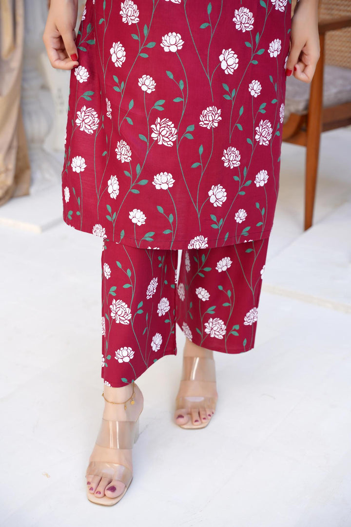 A trendy maroon printed cord set crafted from premium linen fabric. The rich maroon hue and stylish print create a perfect blend of comfort and elegance. Ideal for casual outings or semi-formal events, this outfit offers a modern, effortless look with a touch of sophistication.